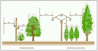 Rappel des distances minimales de recul de la végétation par rapport au réseau Haute Tension 20kV (HTA). En aucun cas la végétation ne doit venir en surplomb du réseau :