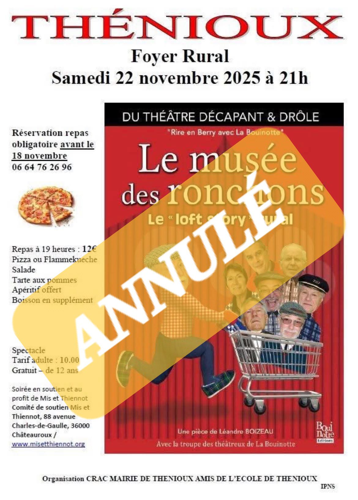 Nous vous informons que la soirée théâtre du samedi 22 novembre 2025 est annulée pour raison de santé.