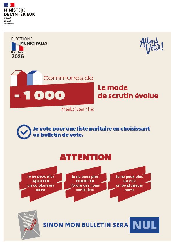 Aujourd’hui, le mode de scrutin est identique dans les 25 000 communes de moins de 1 000 habitants et les autres. Les listes doivent être paritaires et respecter une alternance femme/homme. Le passage à ce mode de scrutin implique le dépôt de listes complètes de candidats et la suppression du panachage. Il n’est donc plus possible d’ajouter / supprimer des noms et de modifier l'ordre de présentation possible lors du vote.